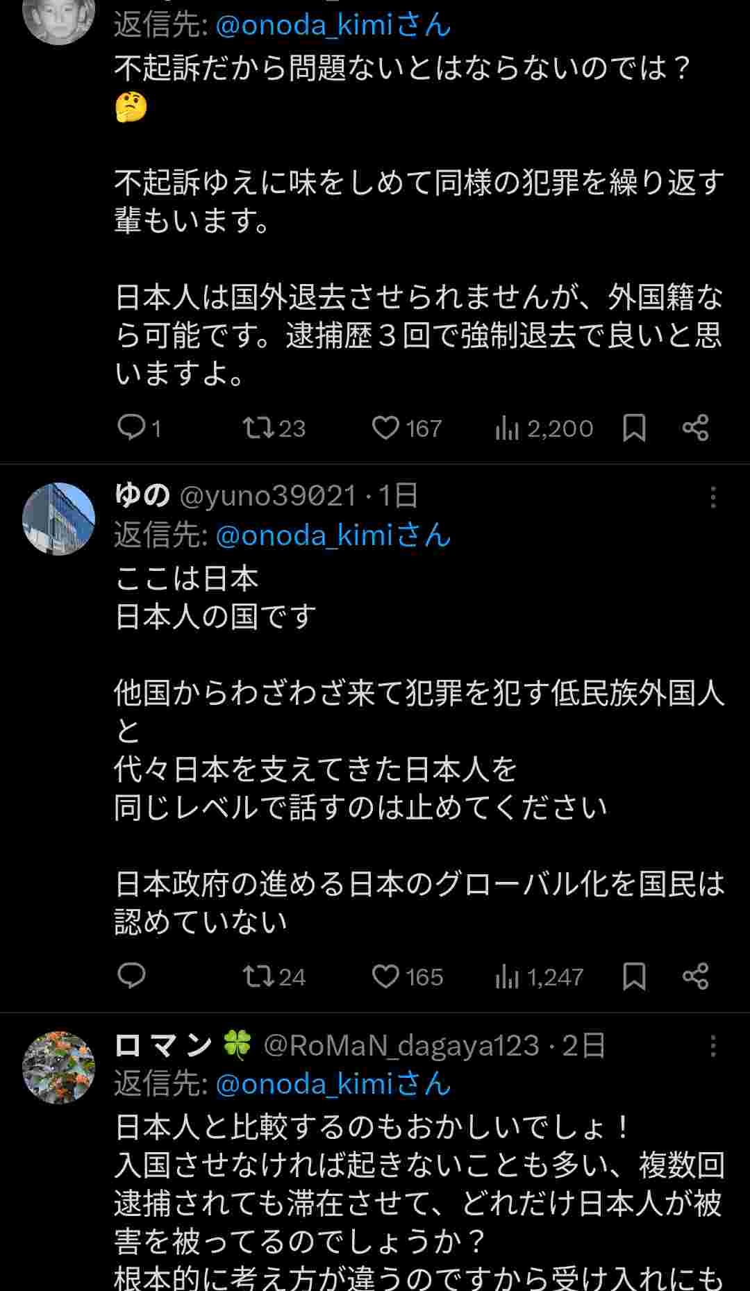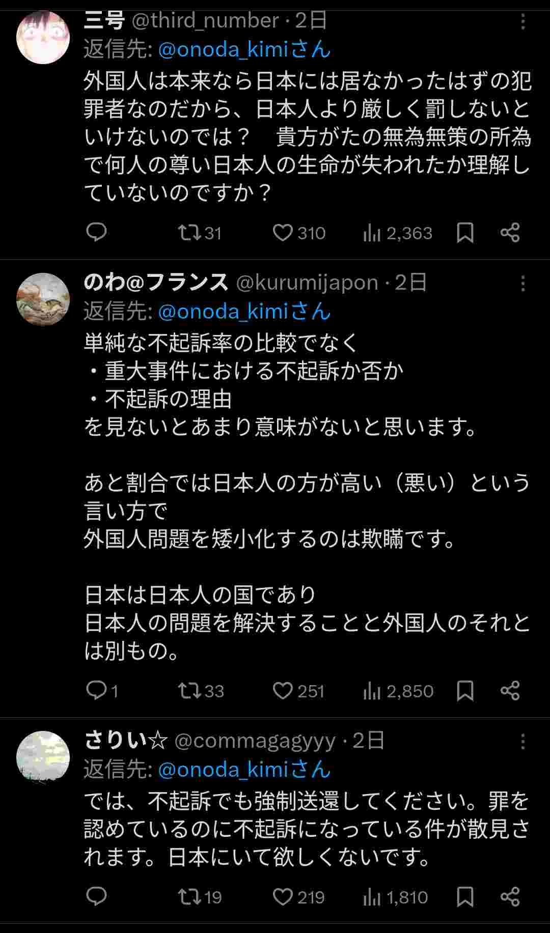 小野田紀美@岡山 (@onoda_kimi) on X不起訴の問題をあげられる方もおられ、憤りは重々分かります。しかし、実際は外国人だから不起訴になっているわけではなく、外国人より日本人の不起訴率の方が高い現実もあります。日本人外国人問わず罪を犯した人間をきちんと起訴していく事が必要で、それは外国人問題とは別に進めなばならぬ政策。x.com - 4 : 2026/01/26(月) 07:51:55.77 ID:k3nRvXNq0