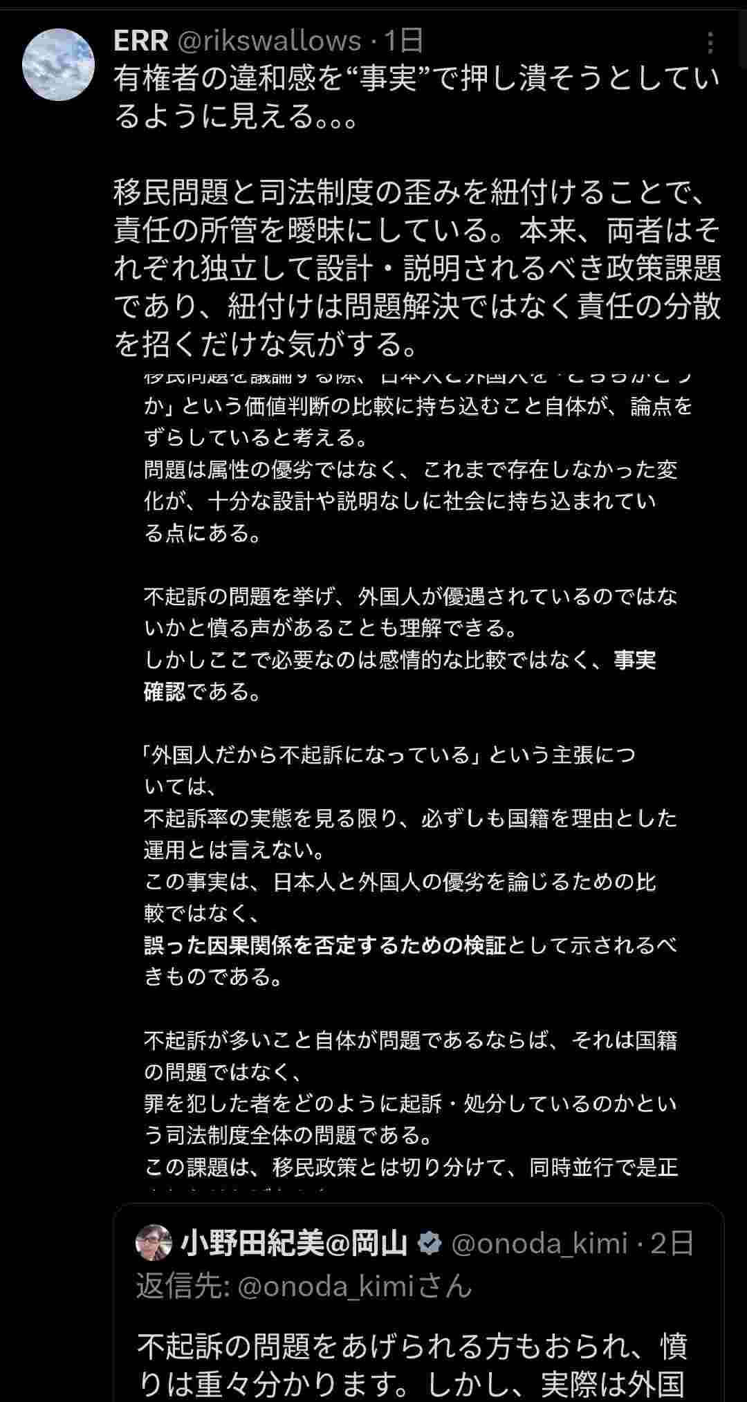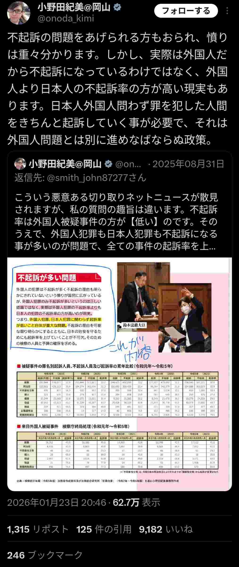 小野田「外国人より日本人の方が不起訴率が高いというのが現実」