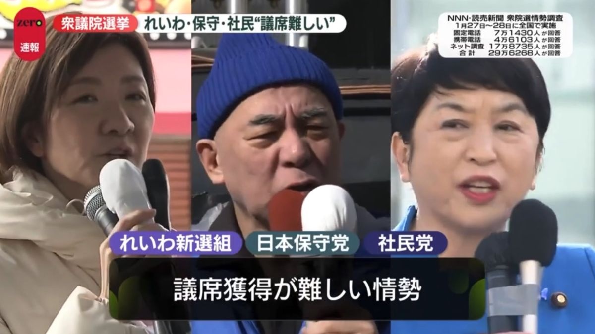 れいわ新選組、日本保守党、社会民主党は議席獲得が難しい情勢です。