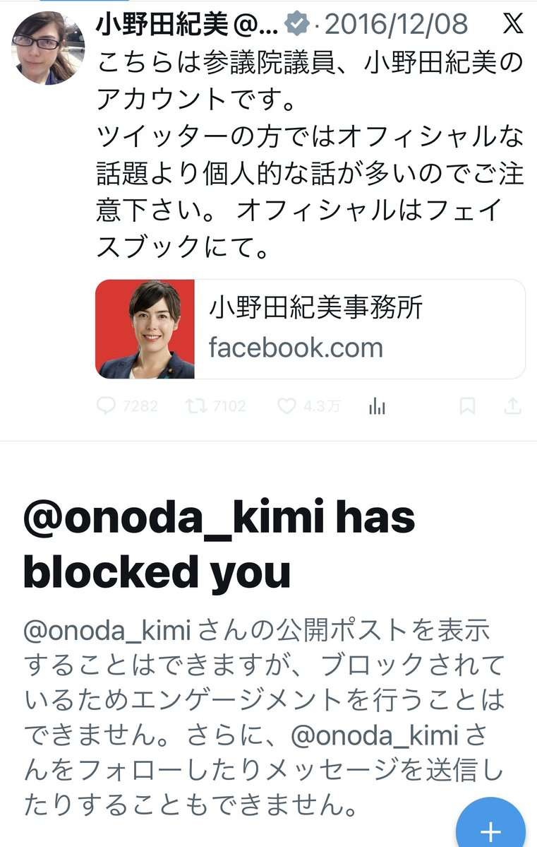 小野田紀美氏(高市政権の外国人政策担当大臣)が、私の下の発信が都合悪かったらしく、ブロックしてきた。