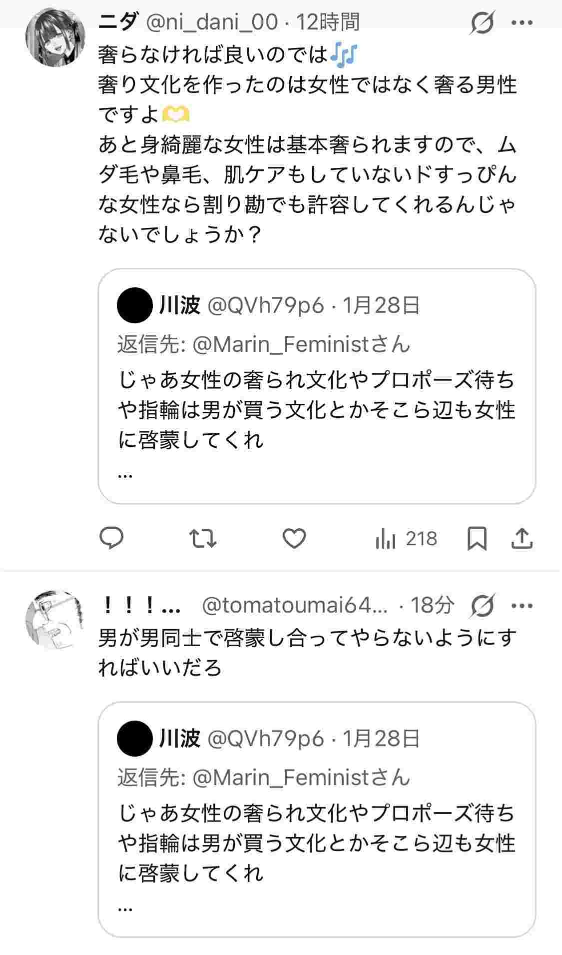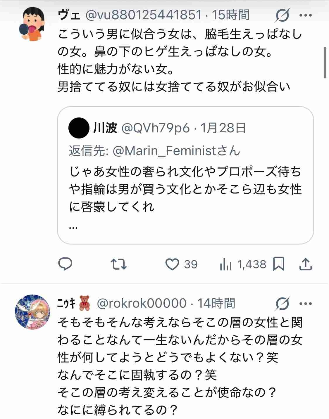 いや、ツイフェミはホストやジャニ、KPOPにはキャーキャー言ってる垢ばかりじゃん本来の「フェミニスト」なんて上野があれな時点で死滅してるよ