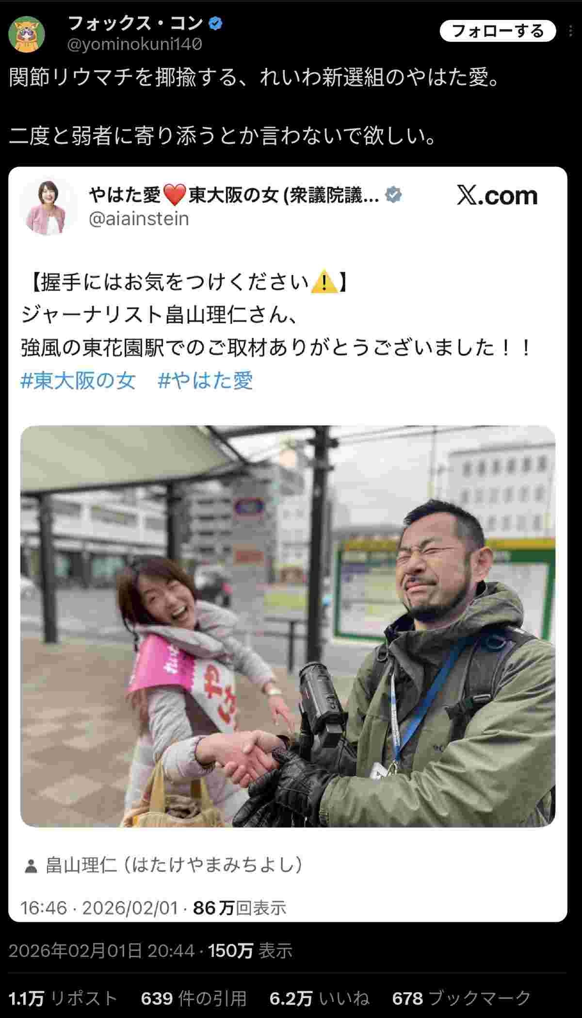 - 握手したら負傷したって当初言ってたのは高市早苗