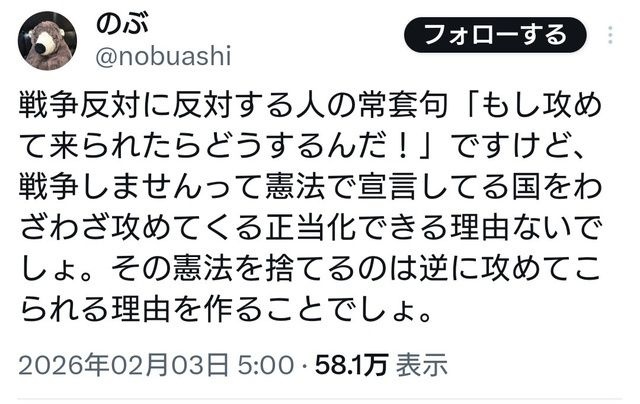 戦争を起こさせない理由作りが割と重要ではあるけど、ネトウヨに通じるわけがないだろこんな論理 - 29 : 2026/02/04(水) 20:54:31.383 ID:x6ObUXOzn