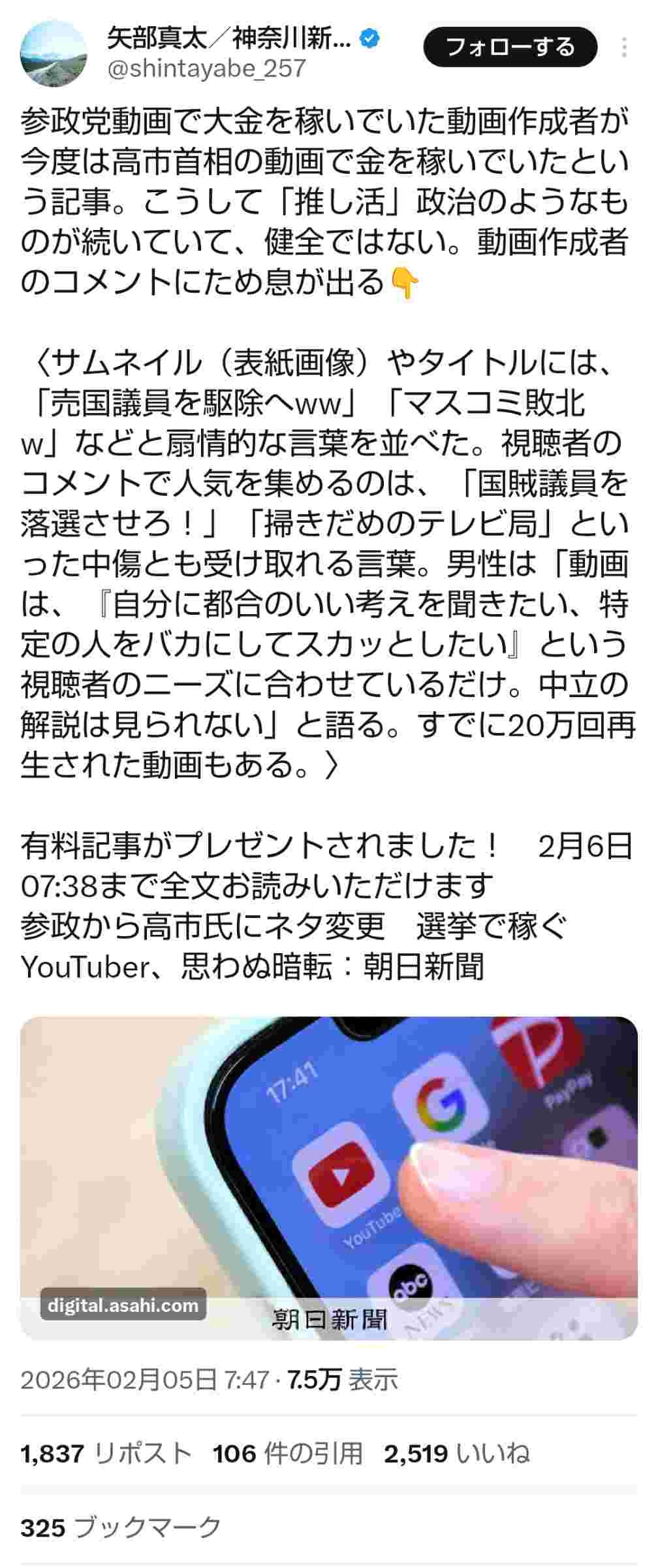 参政から高市氏にネタ変更 選挙で稼ぐYouTuber、思わぬ暗転:朝日新聞衆院選の投開票が近づく中、ネット上には政治系の動画があふれる。中には真偽不明な内容や扇情的な言葉も目立つ。どんな人が動画を作っているのか。動画チャンネルを立ち上げ、月90万円近い収入を得たこともある…www.asahi.com - 42 : 2026/02/05(木) 11:45:11.43 ID:rHAUCxm50