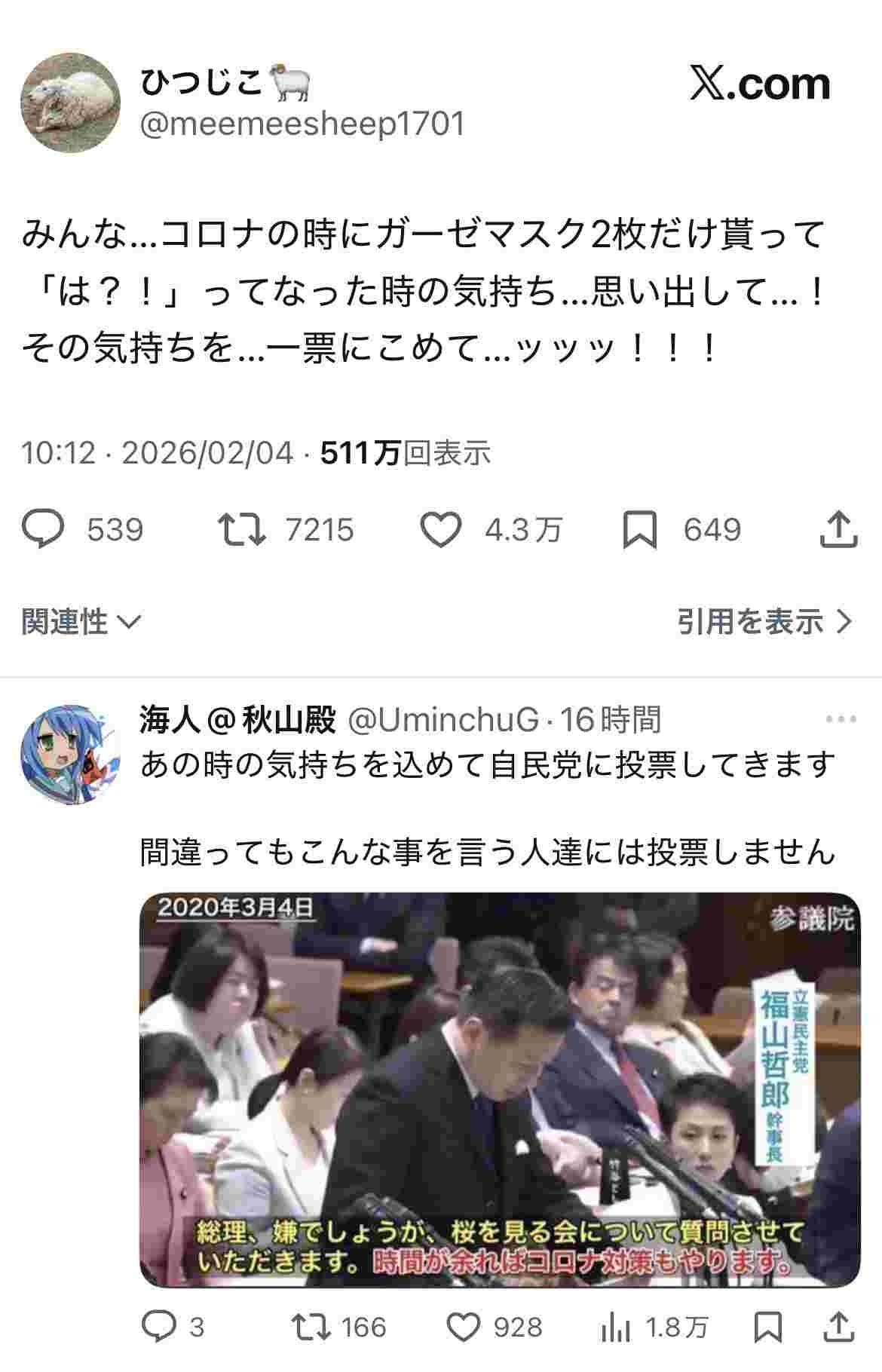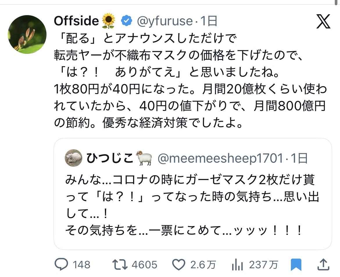 中国が輸出を再開しただけでアベノマスクは何の意味もない金ドブ - 18 : 2026/02/06(金) 00:44:51.10 ID:46YnYU900