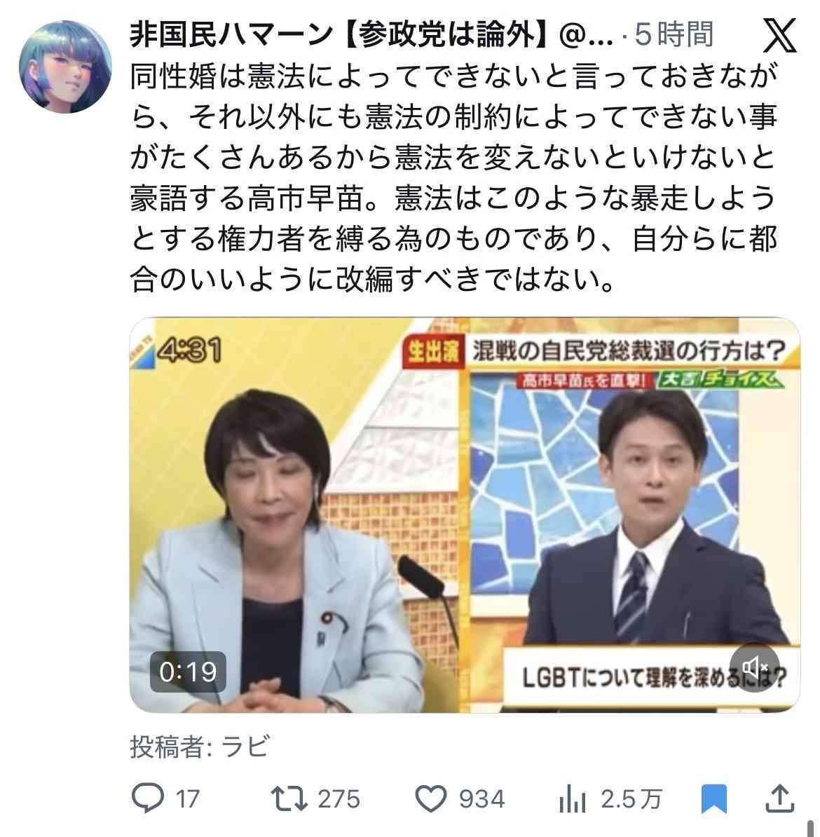 - 憲法改正しても同性婚を認める気はないのが伝わってくるよな