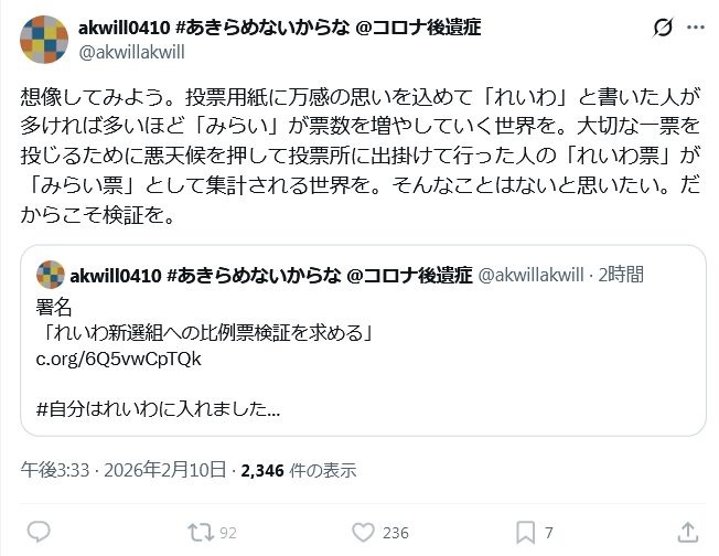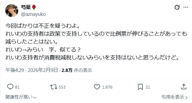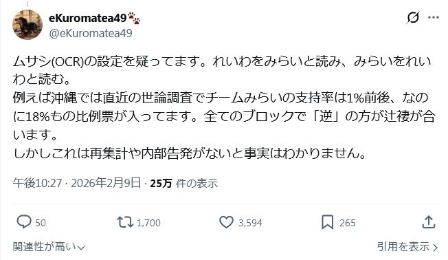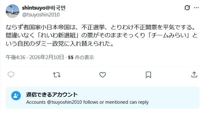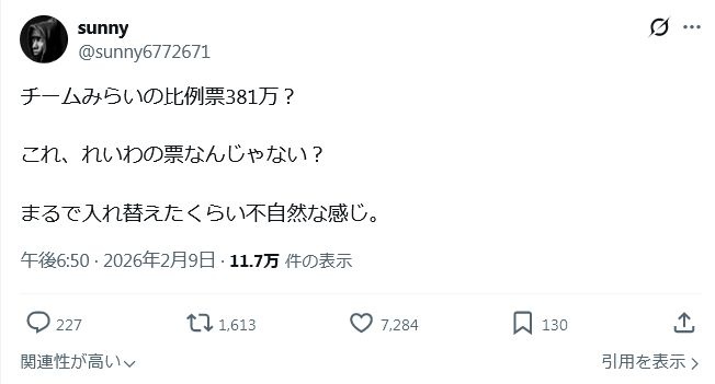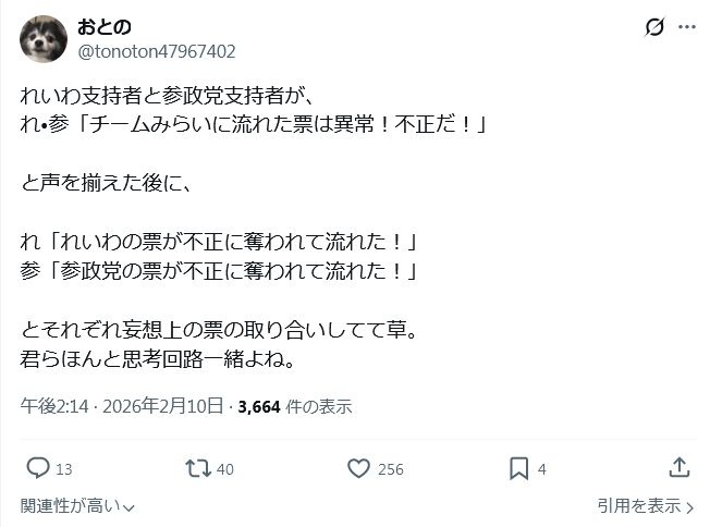 それぐらい怪しい票の取り方してる - 46 : 2026/02/10(火) 17:58:14.48 ID:fek4oMjn0