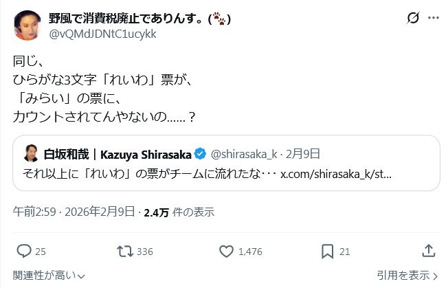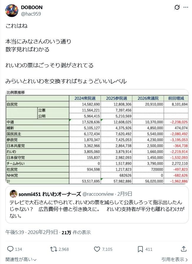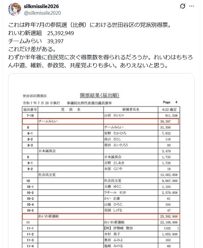 たぶん自民か自民の支援団体が票流しただけとは思うが - 31 : 2026/02/10(火) 17:54:25.72 ID:C7Vf63iY0