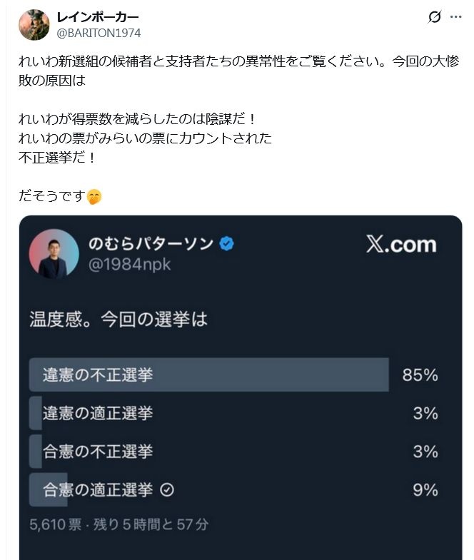 - 極一部のキチゲェが言ってるのかと思いやXのれいわ界隈ではこの陰謀論が主流派になっているという恐怖(トレンド入り)