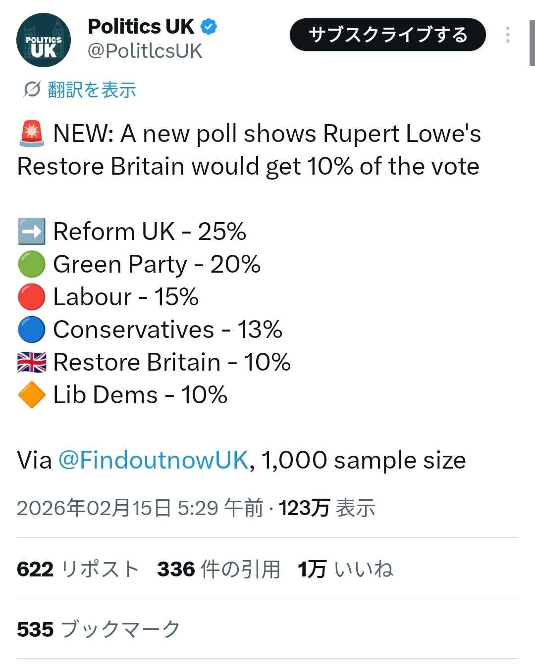 Politics UK (@PolitlcsUK) on X🚨 NEW: A new poll shows Rupert Lowe's Restore Britain would get 10% of the vote ➡️ Reform UK - 25% 🟢 Green Party - 20% 🔴 Labour - 15% 🔵 Conservatives - 13% 🇬🇧 R...x.com - 2 : 2026/02/15(日) 18:44:56.71 ID:UBSqN32a0