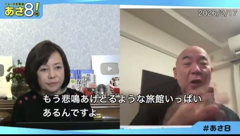 もう客のほとんどが中国人となって。『儲かった儲かった儲かるで儲かるで』って言ってたら、高市さんの発言以来バッと中国人観光客が減ってもうて。ほんならもう赤字でね、客来ない言うて、もう悲鳴あげとるような旅館いっぱいあるんですよ。