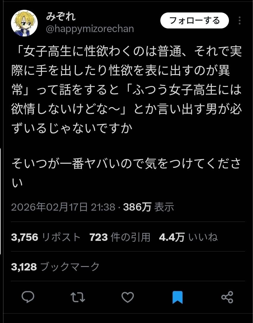 386.8万件の表示https://x.com/happymizorechan/status/2023738936514724177x.com - 2 : 2026/02/18(水) 16:23:37.04 ID:yZ8xaCwI0