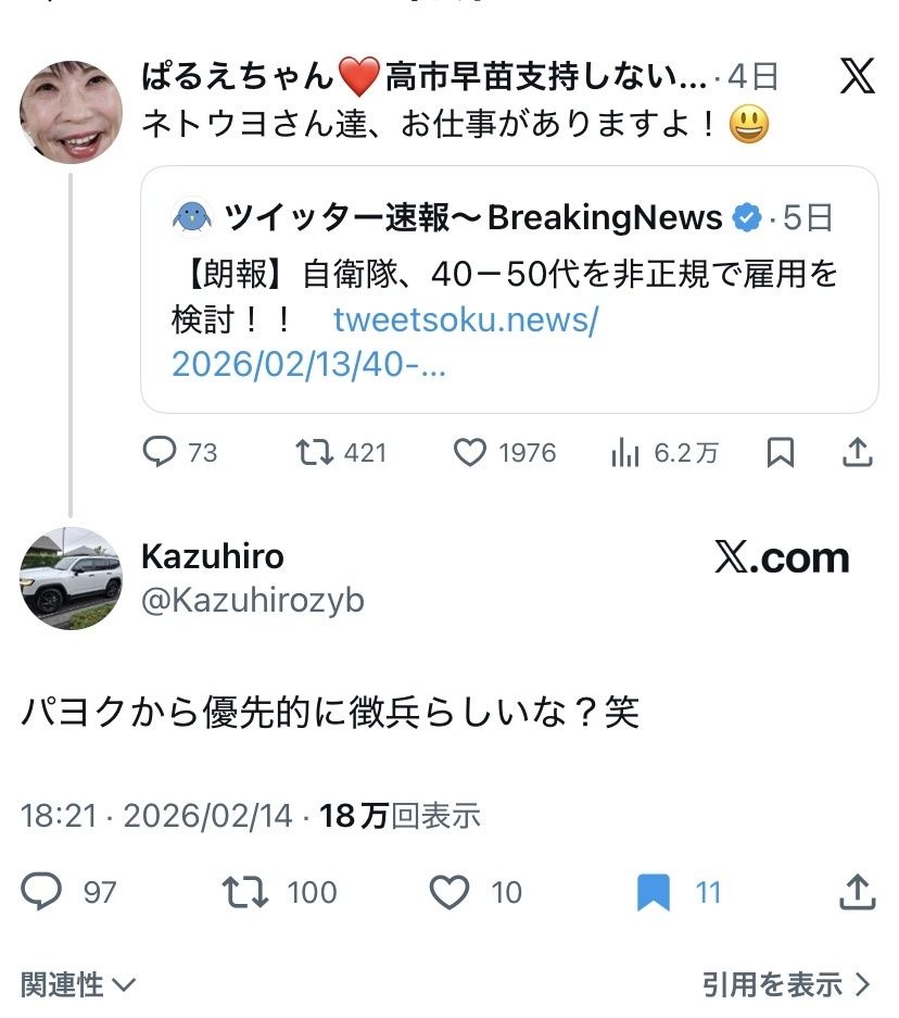 モチベーションの高いネトウヨからだろ - 10 : 2026/02/19(木) 15:38:14.09 ID:2R1J2phh0