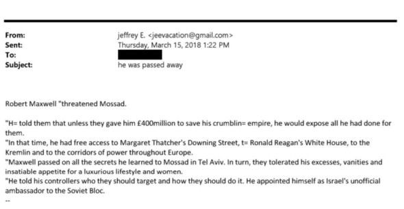 エプスタインも2018年に送信した電子メールに、マクスウェルはイスラエル情報機関を脅迫していたと主張した。彼は「もし、彼ら(モサド)がマクスウェルの没落する帝国(事業体)が求める4億ポンド(約830億円)を提供しなければ、彼(マクスウェル)は(自身が)彼らのために行ったすべてを暴露すると脅迫した」と書いた。エプスタインはまた、マクスウェルが米国、英国、ソ連に関する情報を収集する非公式工作員として働いていたと主張した。
