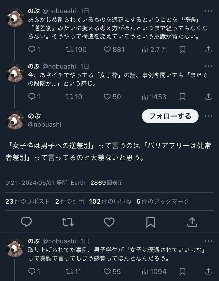 - 女子枠についてなんも思わないってすごいよな