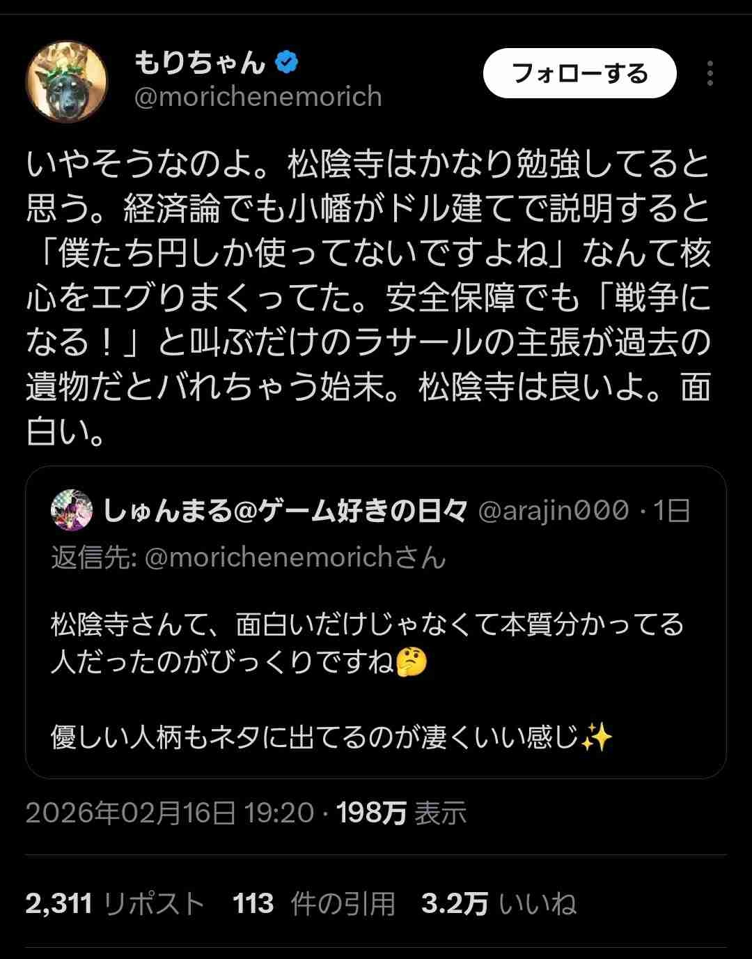 数学や法律で無勉で専門家にレスバ挑む奴はいないけど何故か政治にはいっぱいいる - 33 : 2026/02/24(火) 18:43:54.05 ID:2yhlLOz00