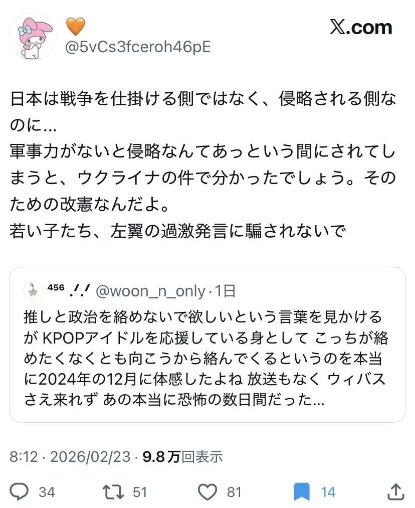 サンリオに怒られろ糞ウヨ - 100 : 2026/02/24(火) 19:29:30.75 ID:XqHXv7OD0