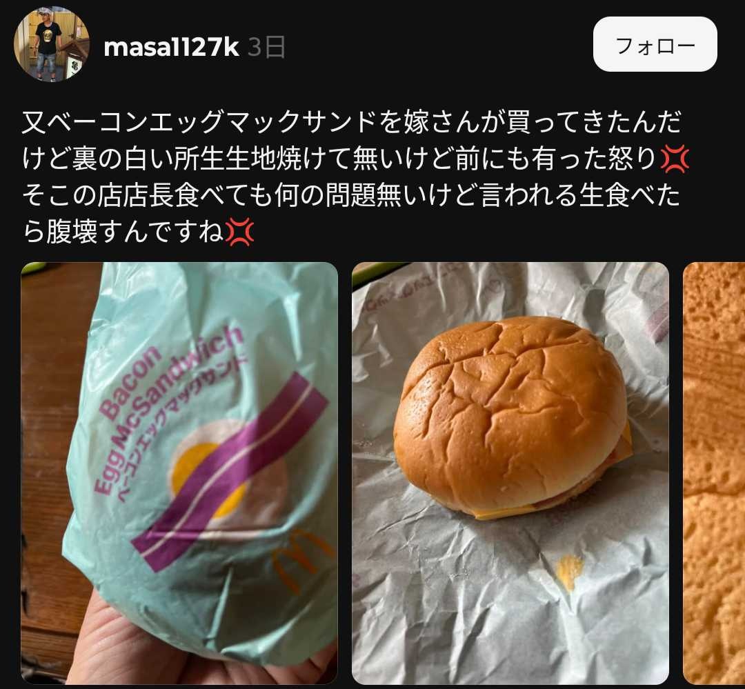 - 又ベーコンエッグマックサンドを嫁さんが買ってきたんだけど裏の白い所生生地焼けて無いけど前にも有った怒り💢そこの店店長食べても何の問題無いけど言われる生食べたら腹壊すんですね💢