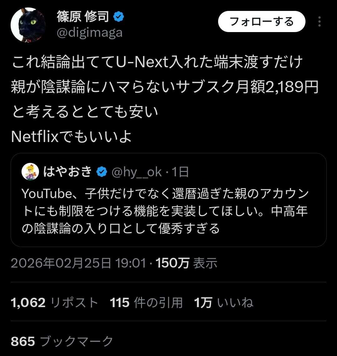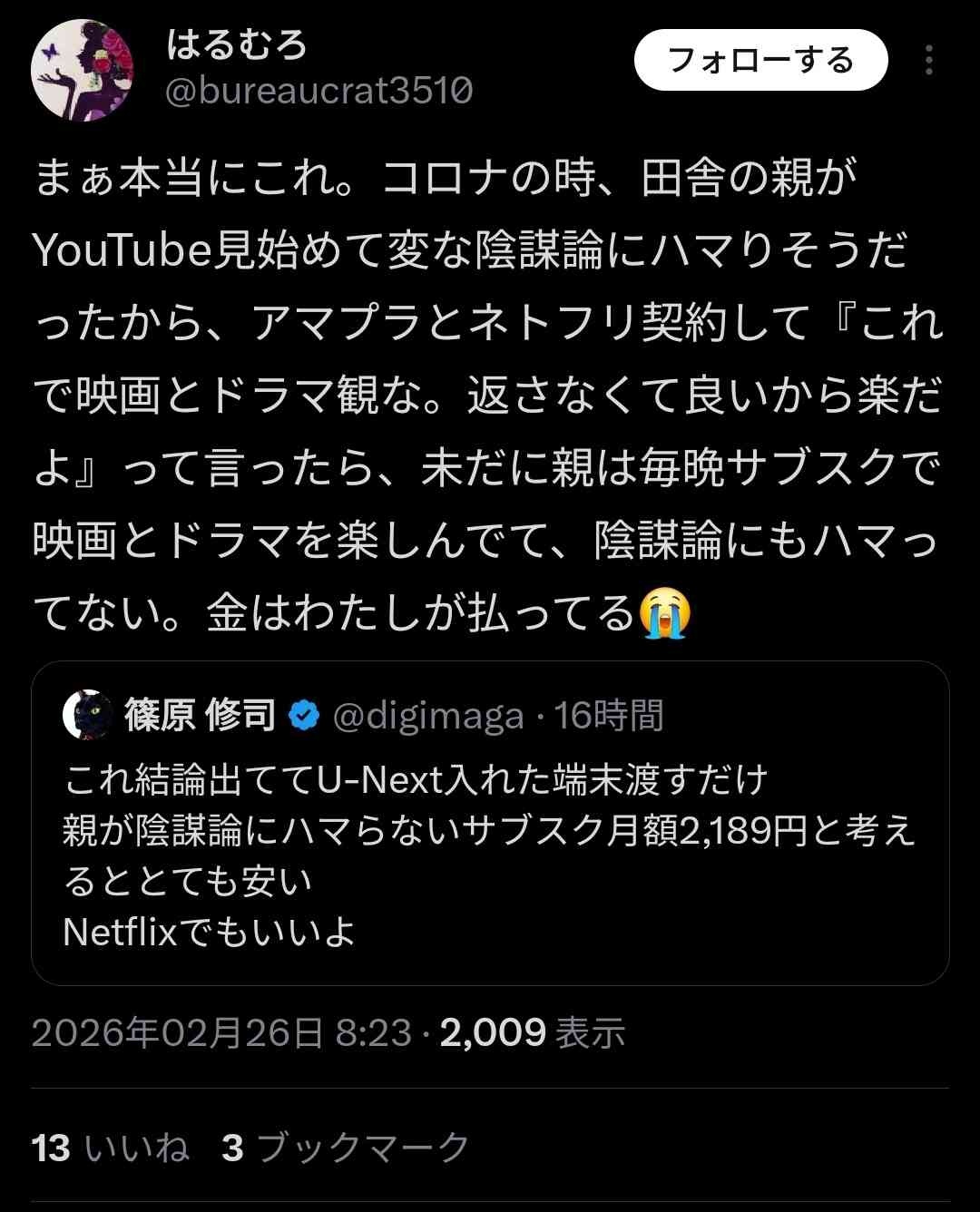 U-NEXT(2189円)→陰謀論にハマらない - 4 : 2026/02/26(木) 11:02:55.027 ID:oCPKDVE1z
