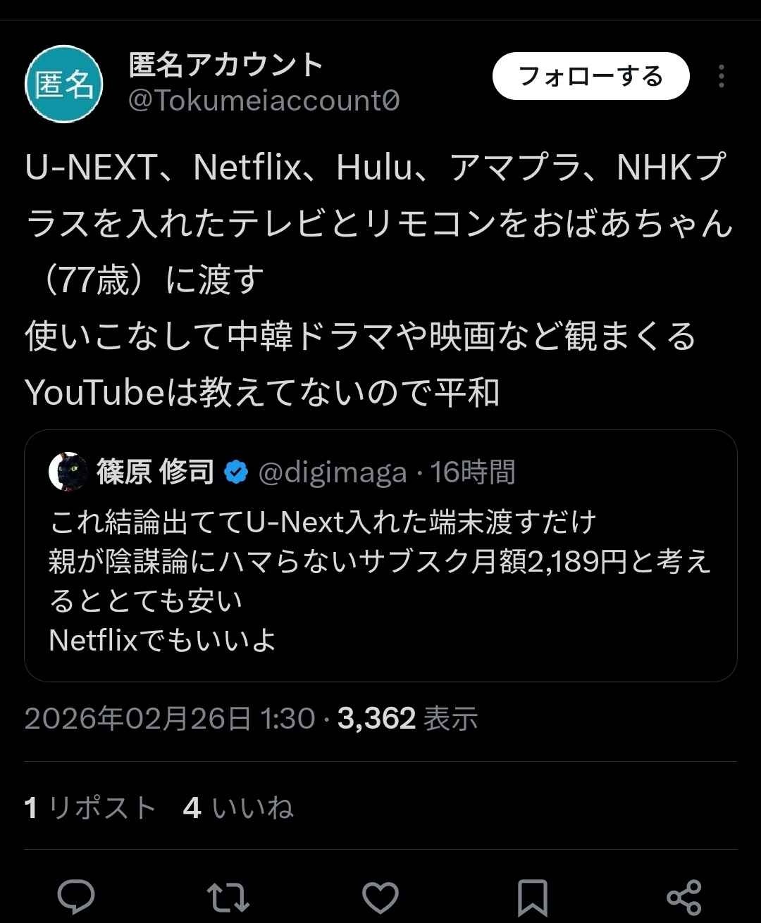 U-NEXTで映画やドラマ見てたらそんなの見る必要ないからな - 22 : 2026/02/26(木) 11:07:23.644 ID:BU6M/D3VS