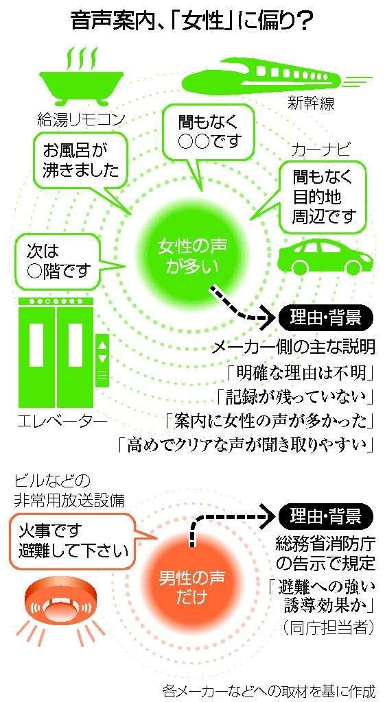 「お風呂が沸きました」。給湯器大手のリンナイ(名古屋市)の給湯リモコンの音声は女性だ。同社は「バスや野球場の案内では女性の声が多い。女性が入浴中に男性の音声を聞いたら驚く可能性も考慮した」と説明。全日空(東京都港区)でも機内の自動音声は女性で、同社は「女性の客室乗務員が多かったこともあるのでは」と指摘する。