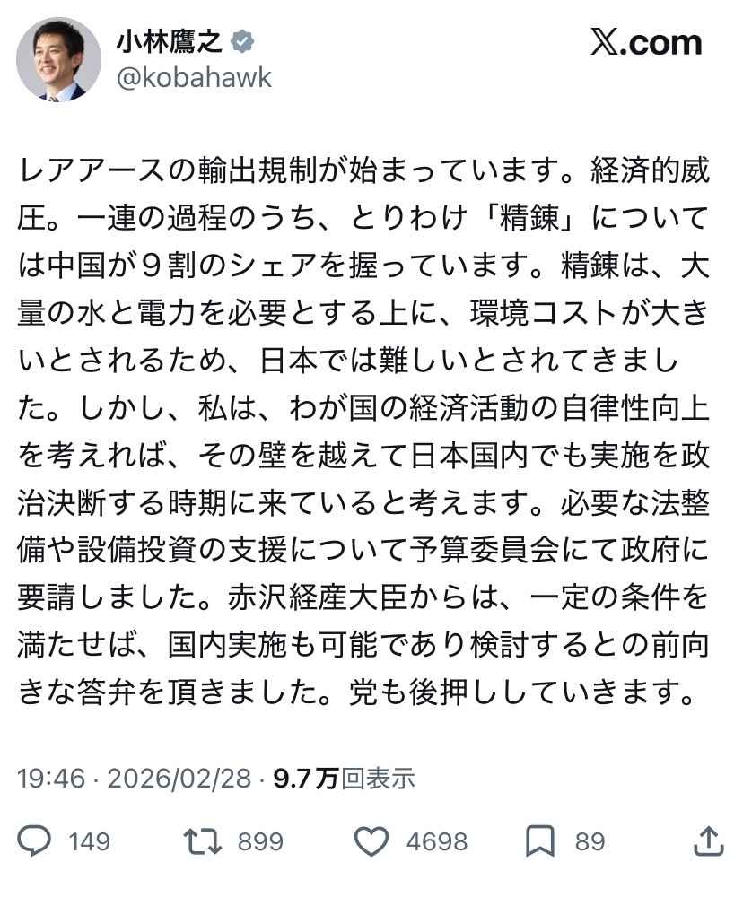 それなのにわざわざこう言うって事は多分レアアース精錬全般復活させようとしてるんじゃないか - 38 : 2026/02/28(土) 22:30:45.756 ID:V1qw4/K+0