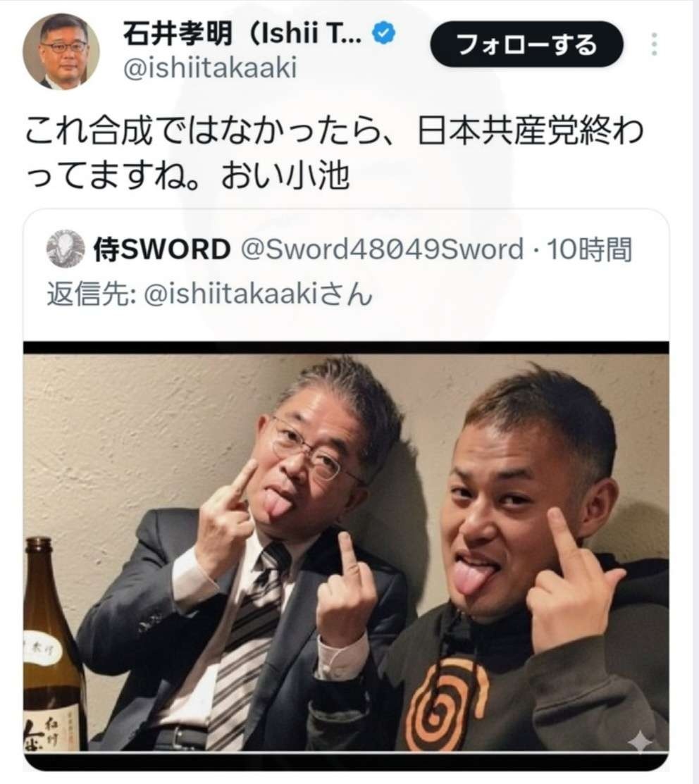 日本共産党の小池晃が中指を立てるフェイク画像(右下にGeminiの透かし)