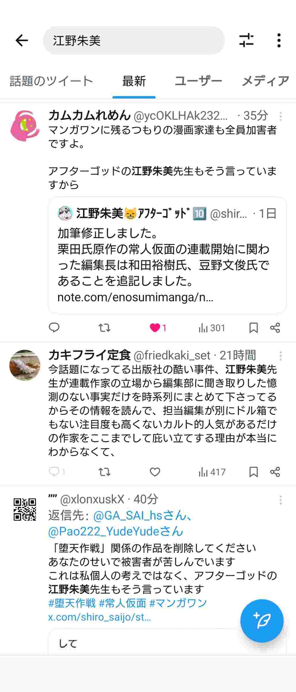 - ワイはわざわざ探そうとは思わないかど、まさか漫画家の中で堕天作戦褒めたツイートとかまだ残してるやつはおらんよなあー?