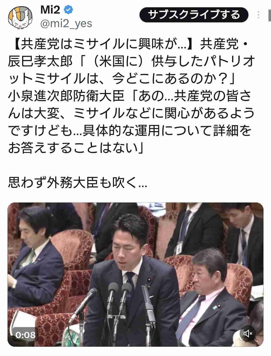 - 日本共産党が配備ミサイルの行方を問い詰め、小泉氏が不審げに見える。防衛装備の隠匿など存在せず、戦略予備弾として保管されたり、訓練用に使われているのが通例だ。軍事費の不正を追求する意図はあるだろうが、日米安保体制の根幹を成す装備の在庫確認すら疑う姿勢はナンセンスであり、国防への理解の欠如と受け取られるに過ぎない。
