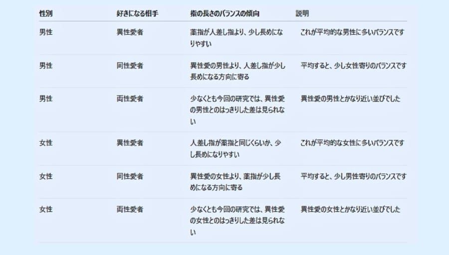 同性にのみ惹かれる男性は、異性愛の男性に比べて、指の比率がわずかに女性的な方向(人差し指が相対的にやや長め)に近づいていました。