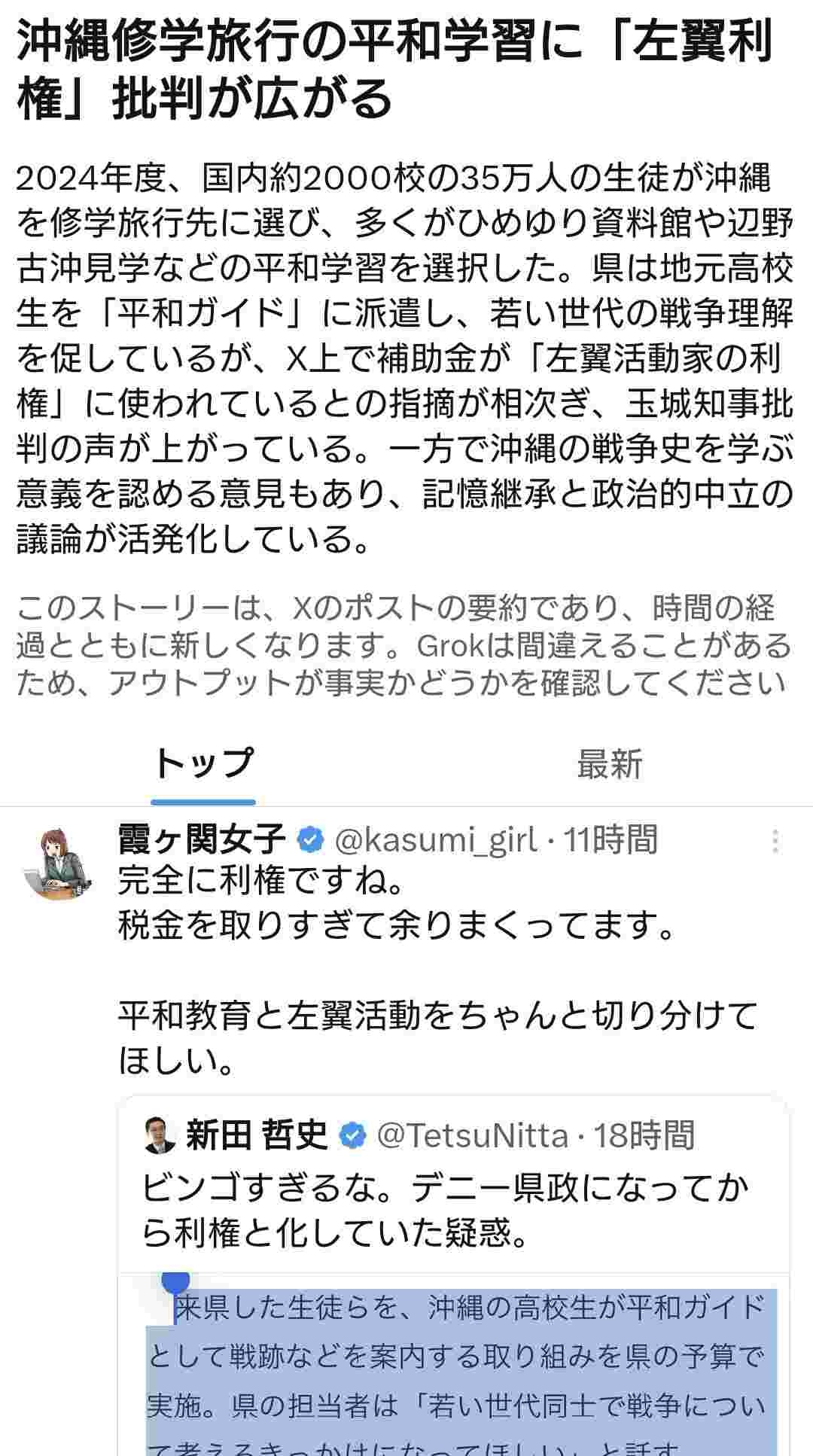 2024年度、国内約2000校の35万人の生徒が沖縄を修学旅行先に選び、多くがひめゆり資料館や辺野古沖見学などの平和学習を選択した。県は地元高校生を「平和ガイド」に派遣し、若い世代の戦争理解を促しているが、X上で補助金が「左翼活動家の利権」に使われているとの指摘が相次ぎ、玉城知事批判の声が上がっている。一方で沖縄の戦争史を学ぶ意義を認める意見もあり、記憶継承と政治的中立の議論が活発化している。