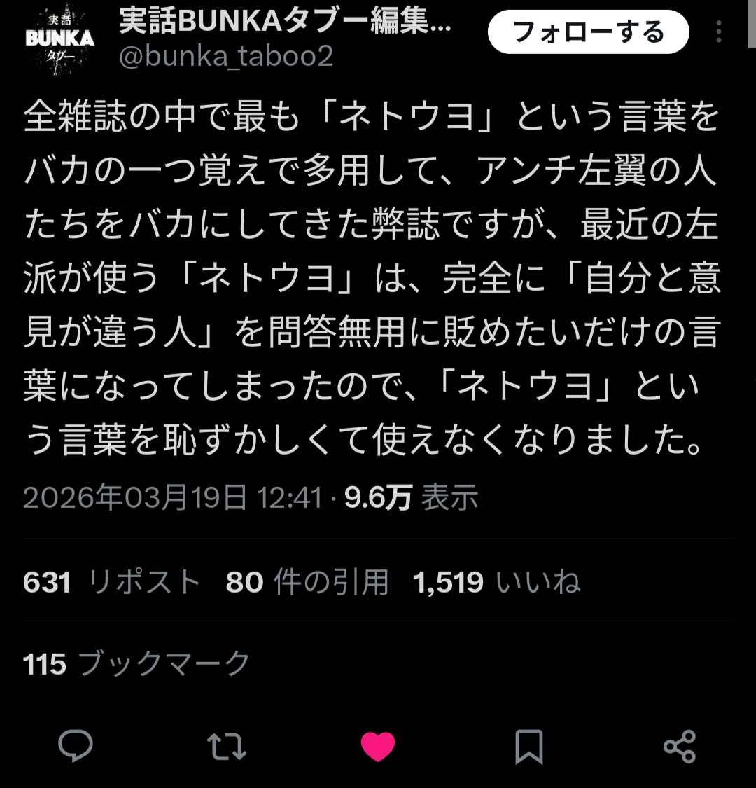ネトウヨ=恥ずかしい存在、みたいな意味に変化してそんな言葉まで生まれてるの面白いな - 77 : 2026/03/19(木) 17:46:01.53 ID:mdGV6iLZM