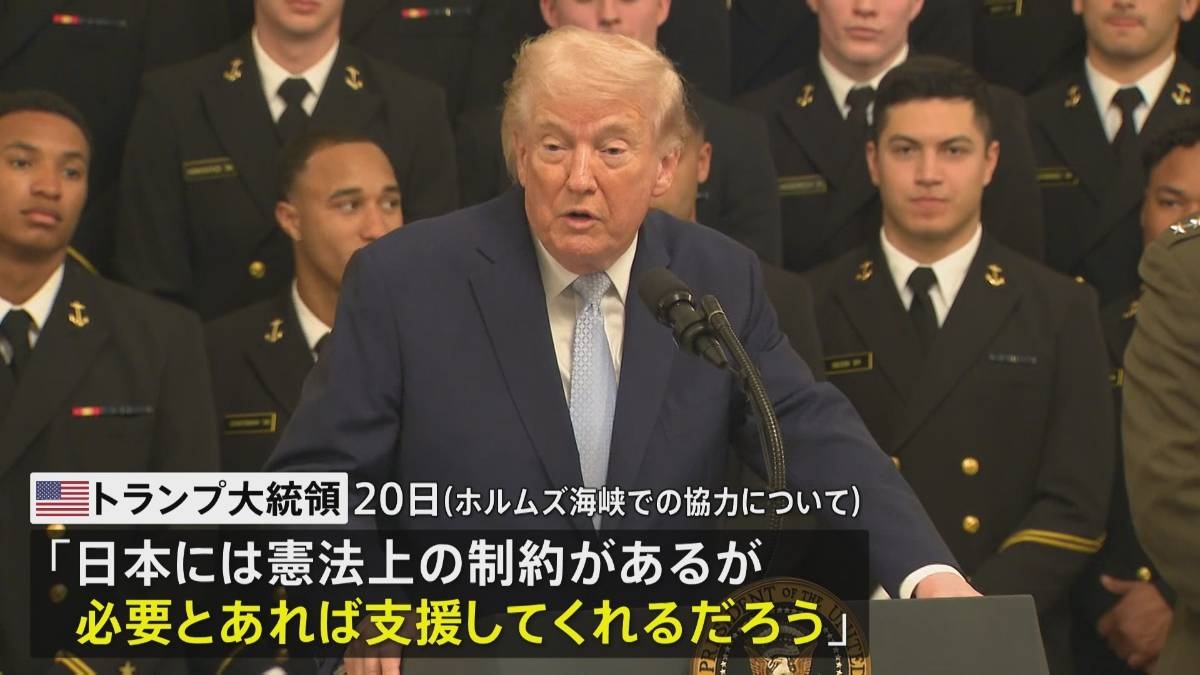 トランプ氏は20日、FOXニュースの取材に対し、ホルムズ海峡での協力について、「日本には憲法上の制約があるが、必要とあれば支援してくれるだろう」と話したということです。