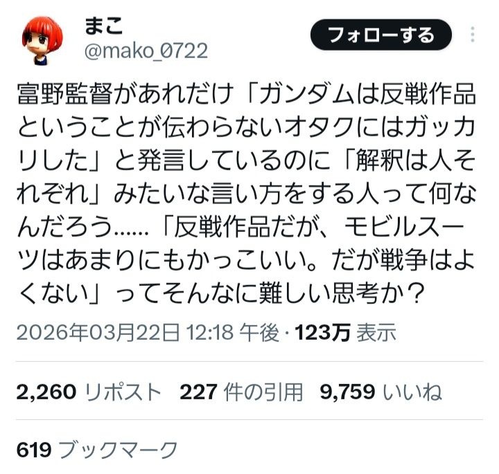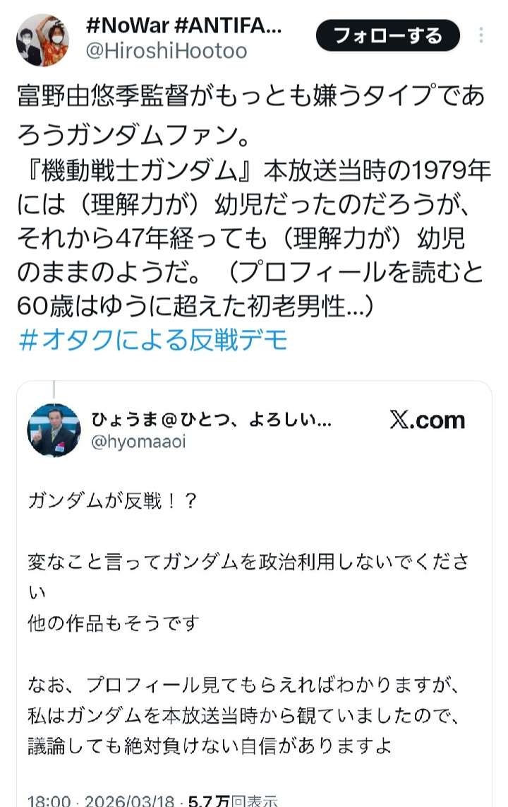 この件の前提はガノタの爺が「戦争否定にガンダムを使うな」とキレたことだぞアホゲェジ - 17 : 2026/03/23(月) 15:38:47.65 ID:7LbtHcxt0