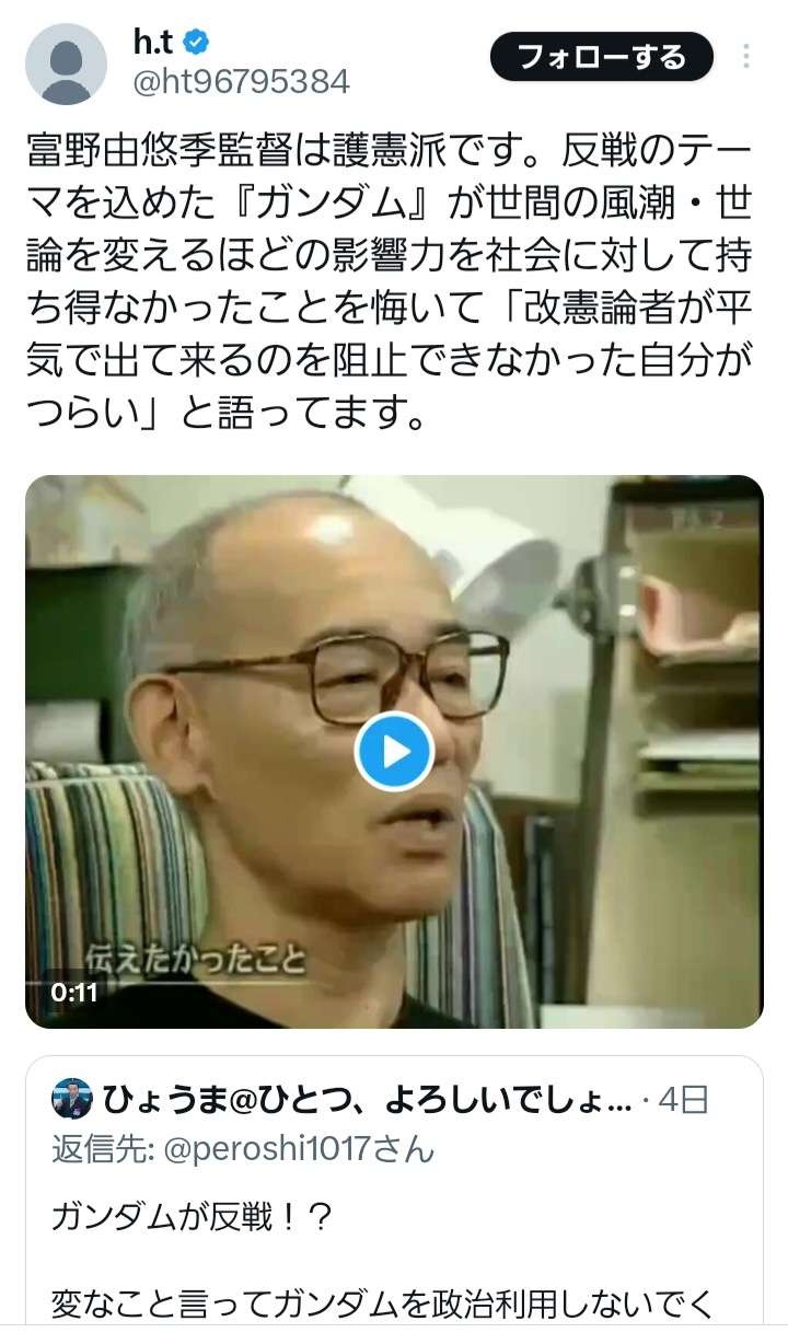 - 富野が反戦をテーマにガンダムを描いたという根拠を本人の発言から次々と突きつける左翼たち