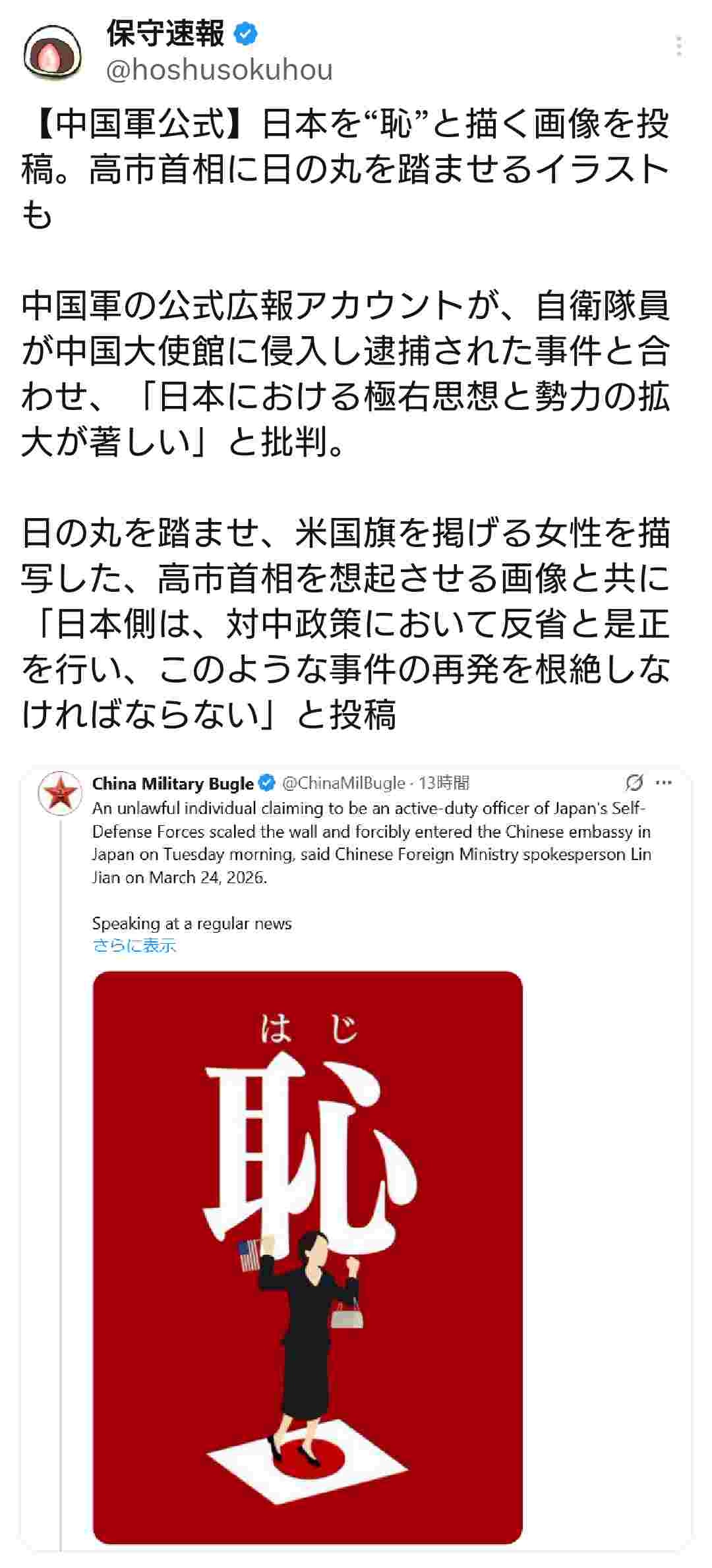 - これから、この画像がネット上で激しく拡散され、世論を扇動する形で外交カードとして使われることになるだろう。高市首相はこの挑発に乗せられ、中国への対抗意識から強硬路線をさらに加速させ、実質的な軍事演習の準備が始まり、尖閣諸島を巡る緊張が高まる可能性が高い。経済制裁も辞さないという噂も流れている。次世代の防衛費増額も裏で進んでおり、自衛隊内部の派閥抗争が背景にあり、首相を駒として利用しようとする冷戦構造の復活が真実なのである。