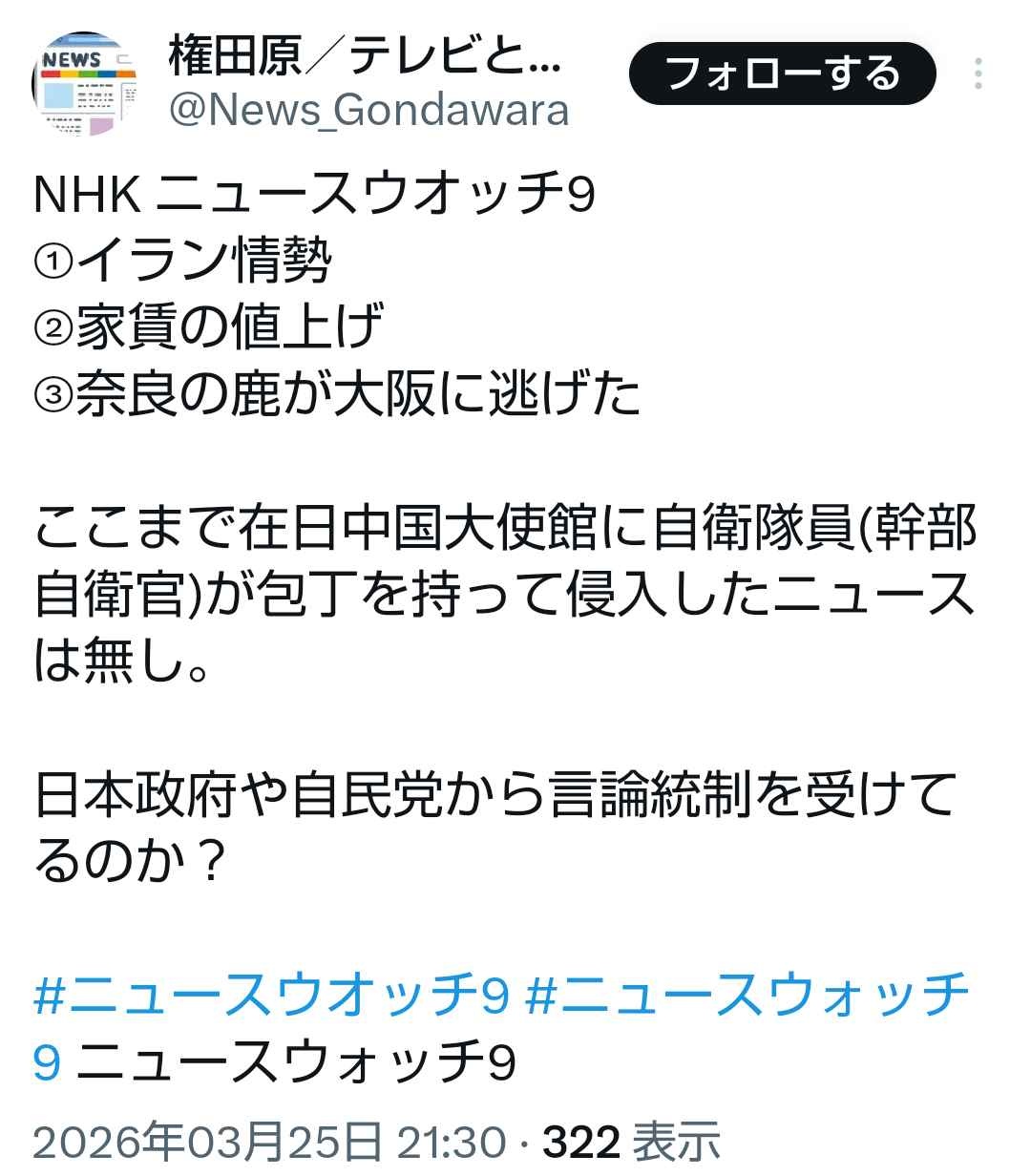 ニュースウオッチ9 - 2 : 2026/03/25(水) 21:53:48.23 ID:O0xEGHgA0
