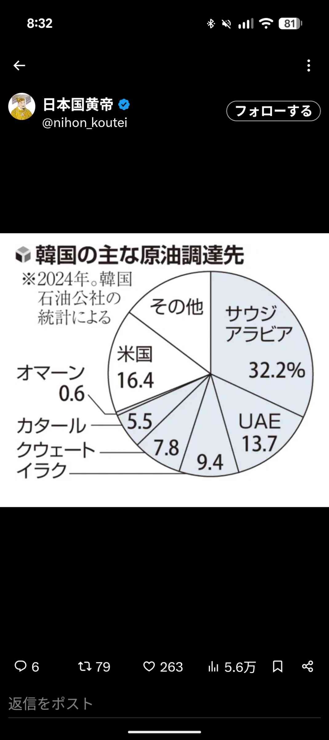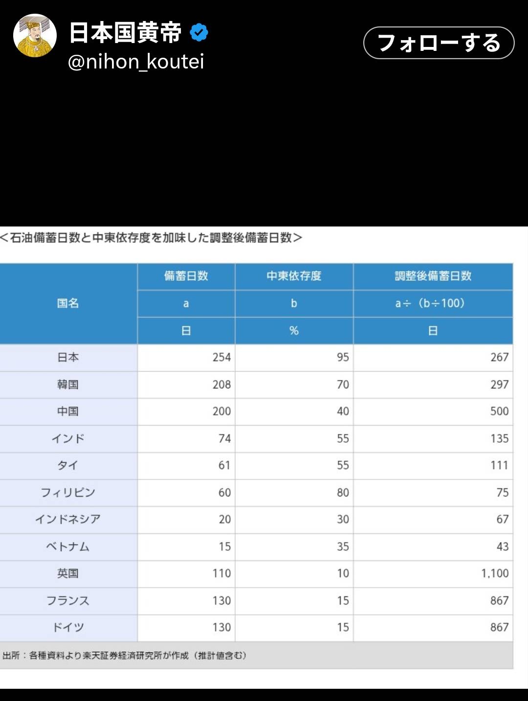 - なお韓国は中東への依存度が日本よりも低く、実質的な備蓄量は日本よりも多いんやで