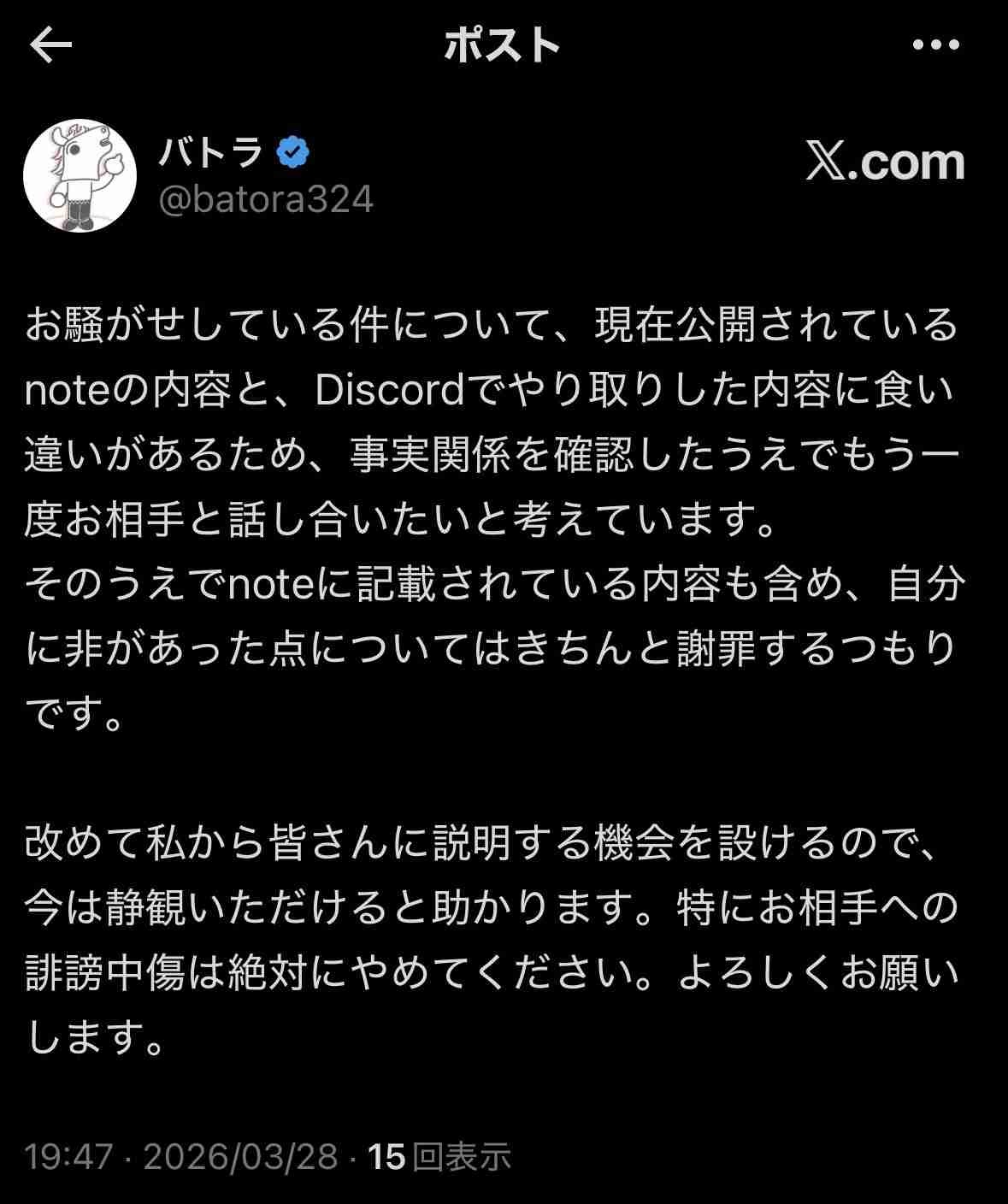 - お騒がせしている件について、現在公開されているnoteの内容と、Discordでやり取りした内容に食い違いがあるため、事実関係を確認したうえでもう一度お相手と話し合いたいと考えています。
