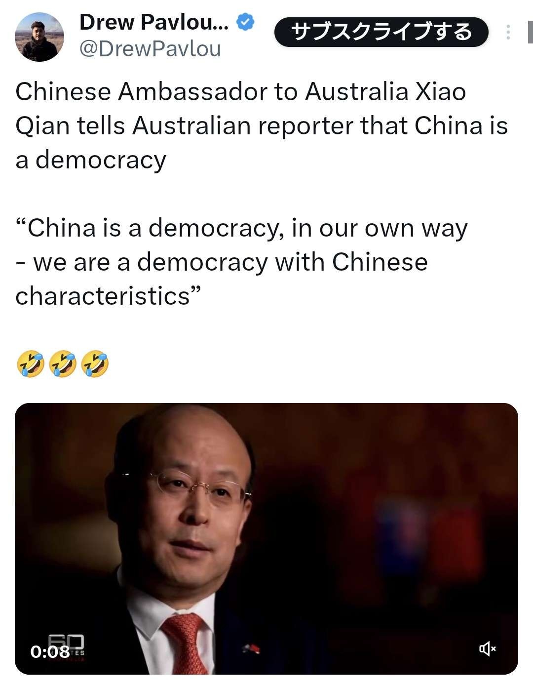 中国の肖謙駐オーストラリア大使は、オーストラリア人記者に対し、中国は民主主義国家だと語った。