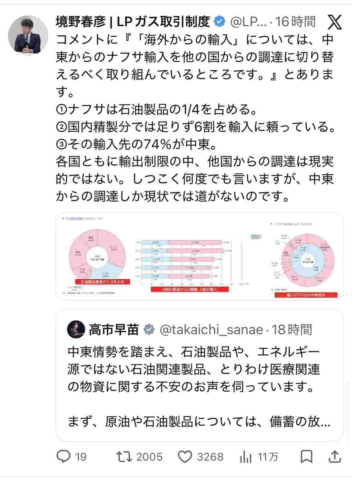 境野春彦 | LPガス取引制度 (@LPGadvisorJP) on Xコメントに『「海外からの輸入」については、中東からのナフサ輸入を他の国からの調達に切り替えるべく取り組んでいるところです。』とあります。 ➀ナフサは石油製品の1/4を占める。 ➁国内精製分では足りず6割を輸入に頼っている。 ➂その輸入先の74%が中東。x.com - 2 : 2026/03/30(月) 17:54:58.030 ID:W4an7Awd9