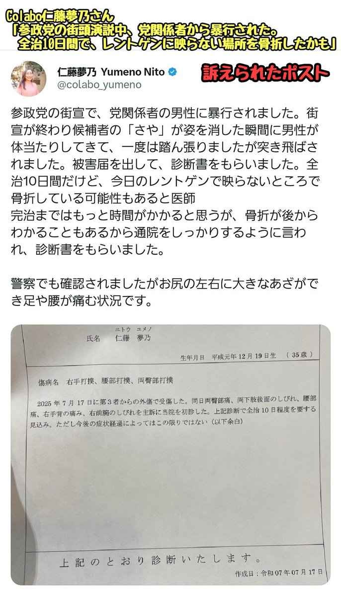 仁藤さん「参政党関係者から暴行を受けました!全治10日間のケガをしました!」