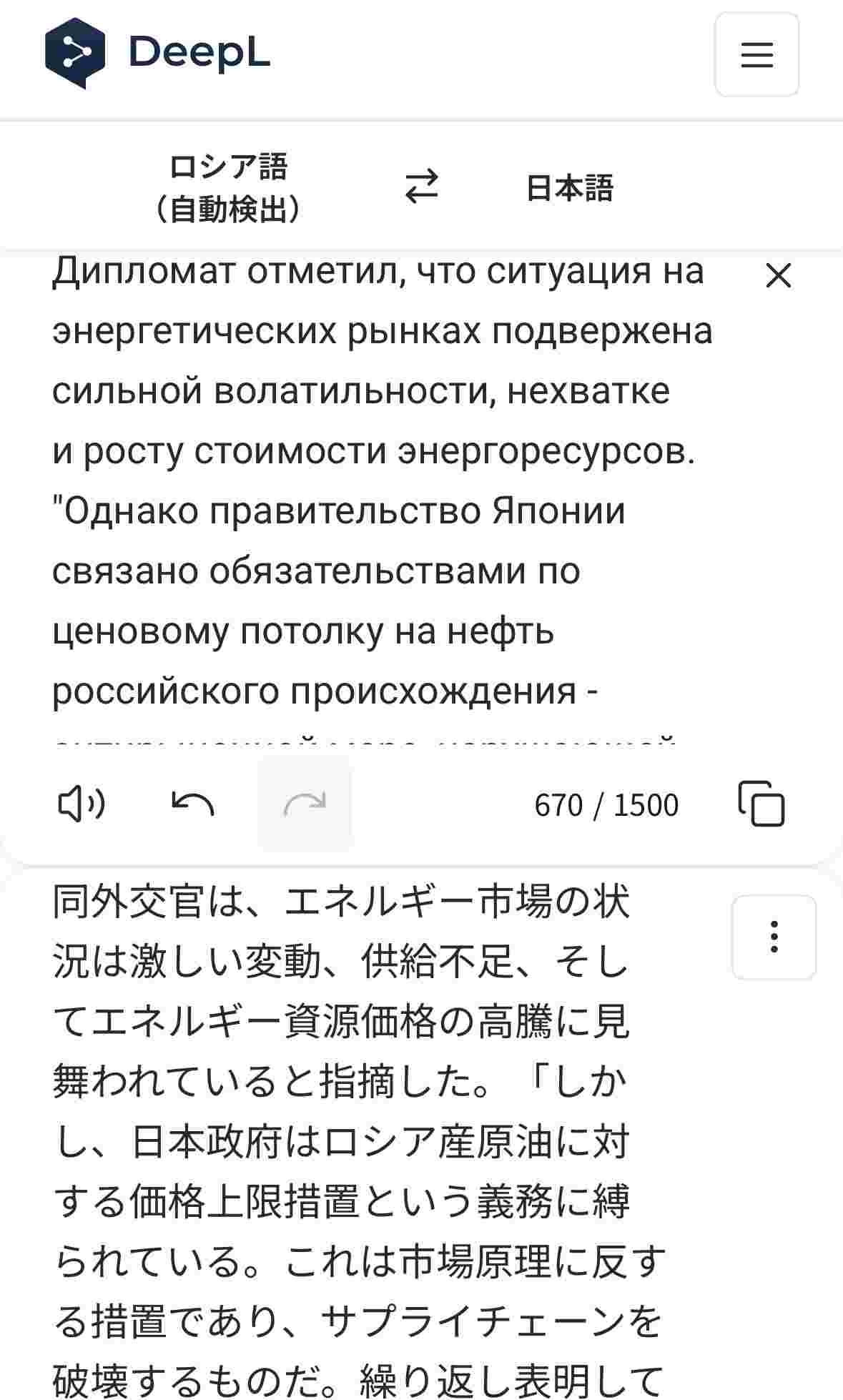 - 同外交官は、エネルギー市場の状況は激しい変動、供給不足、そしてエネルギー資源価格の高騰に見舞われていると指摘した。「しかし、日本政府はロシア産原油に対する価格上限措置という義務に縛られている。これは市場原理に反する措置であり、サプライチェーンを破壊するものだ。繰り返し表明してきた通り、ロシアはこの挑発的な企てを支持する国々への石油供給を行わない」と同氏は同紙に語った。