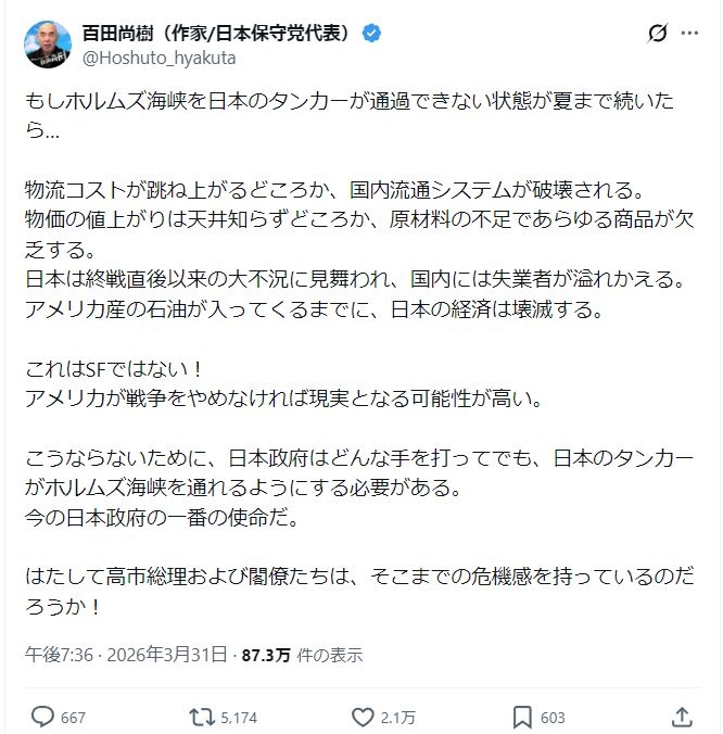 百田ですら高市よりマシらしい - 45 : 2026/04/01(水) 14:41:26.90 ID:b8nJRDtfH