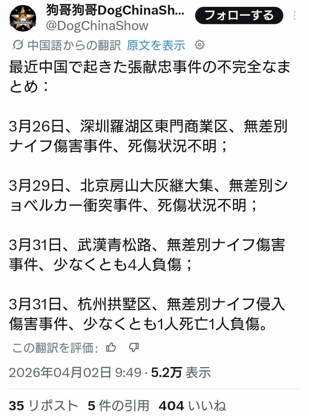 でも人口10倍って考えたら発生率で言えば日本よりむしろ安全なぐらいなんだよな - 13 : 2026/04/03(金) 10:12:23.10 ID:i5N6ngGs0