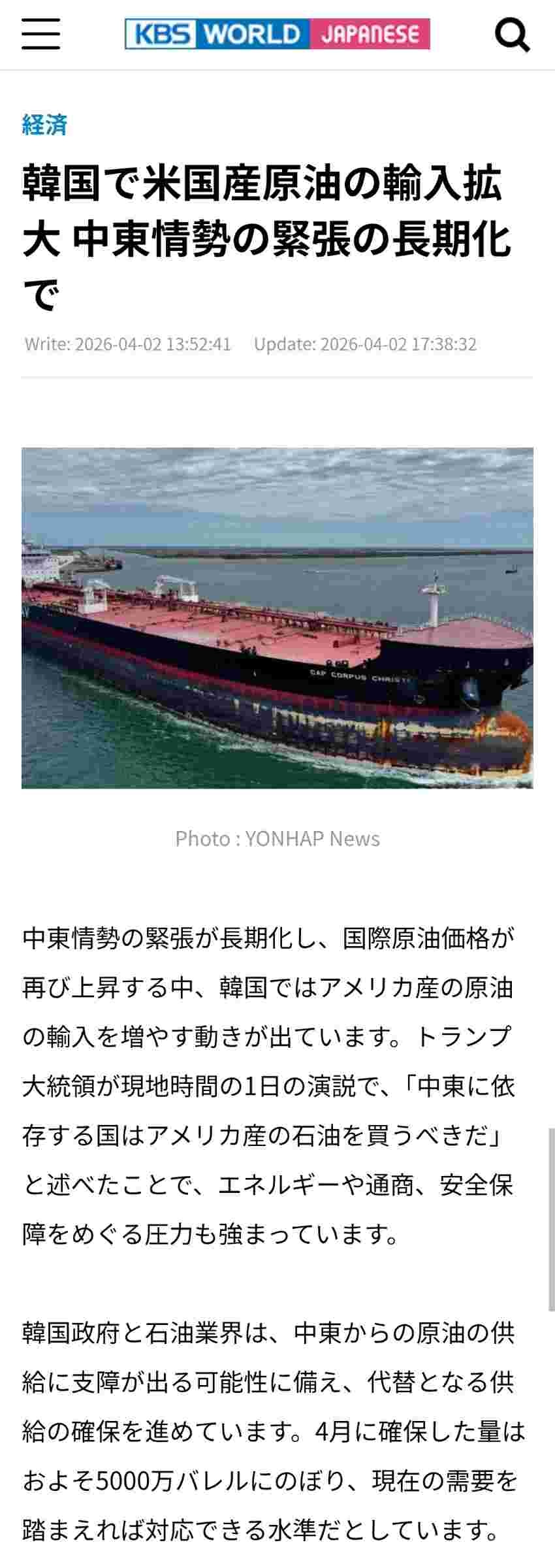 韓国政府と石油業界は、中東からの原油の供給に支障が出る可能性に備え、代替となる供給の確保を進めています。4月に確保した量はおよそ5000万バレルにのぼり、現在の需要を踏まえれば対応できる水準だとしています。