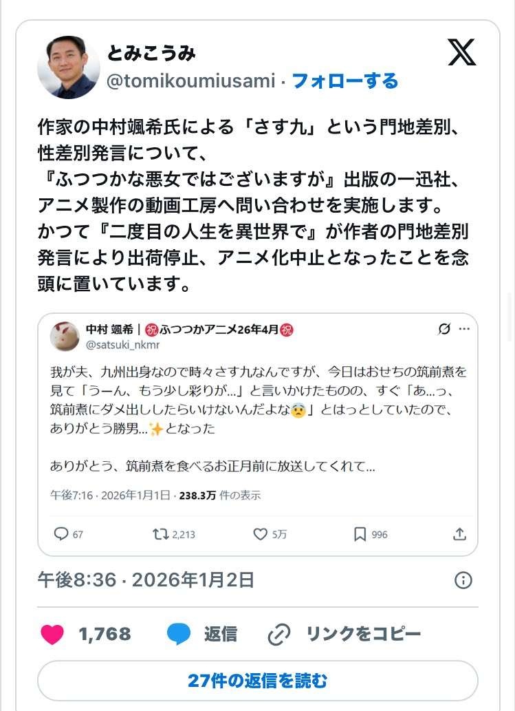 - ラノベ作家 中村颯希氏の「さす九」発言が波紋 かつて『二度目の人生を異世界で』が作者の門地差別発言によりアニメ化中止
