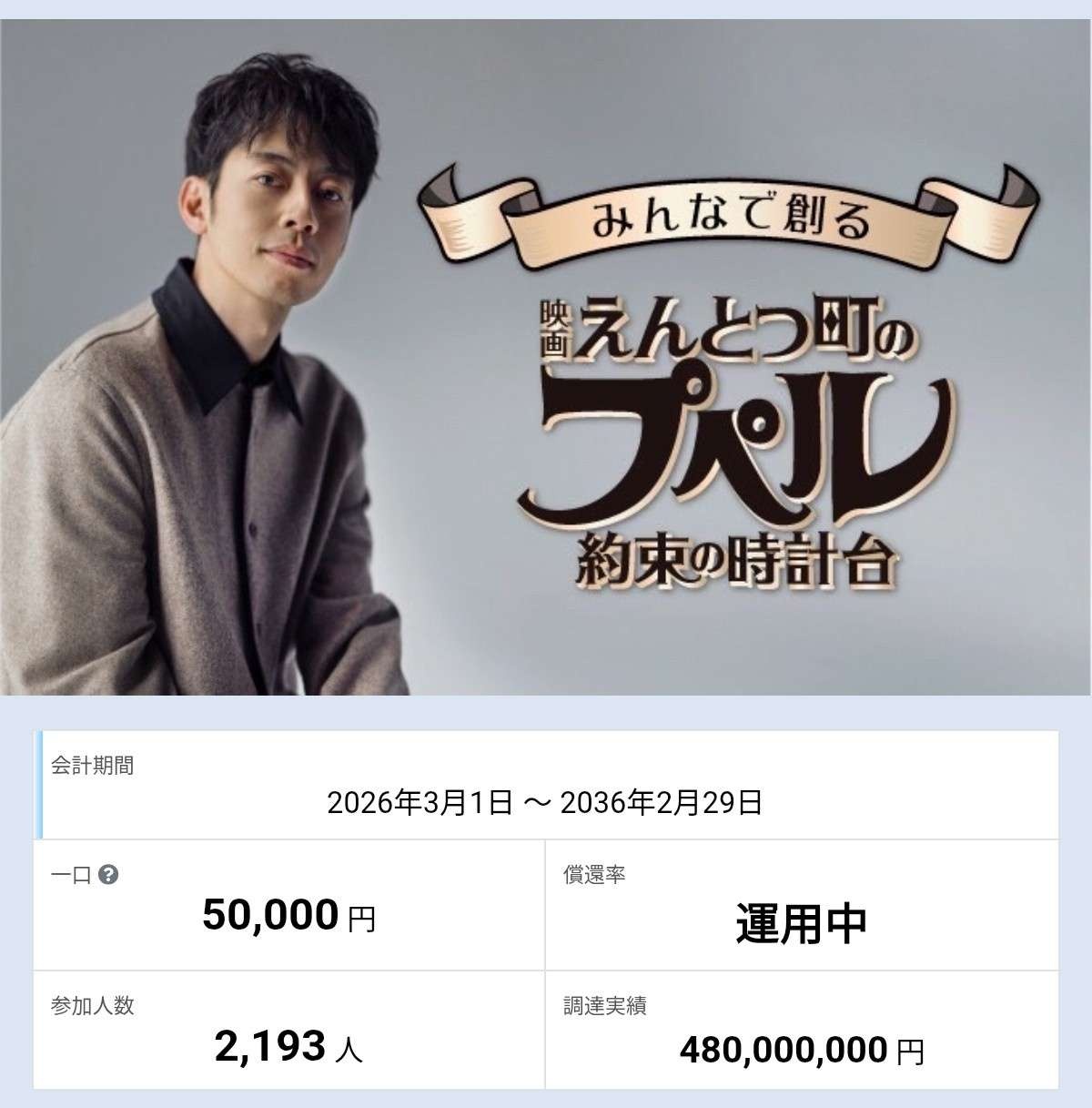 その続編となる『プペル2』では、製作費の一部を事業投資型クラウドファンディングを通じて募集。1口5万円にもかかわらず、応募開始から1日半で目標額となる4億8000万円を調達した。
