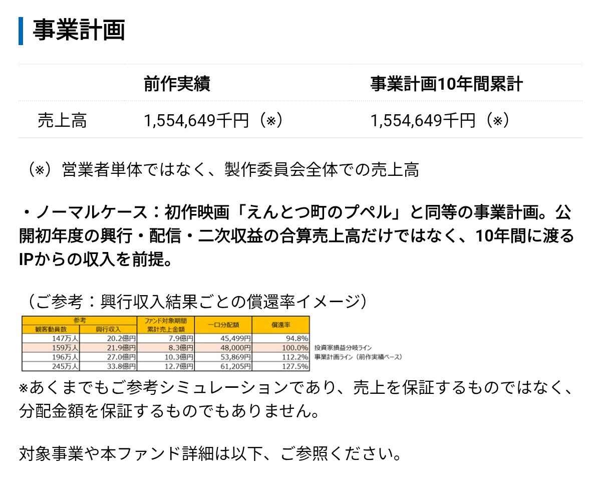 今回の『プペル2』でのクラファンは、“投資”という形で参加者から資金を募り、10年間のファンド運営期間中の売上を“分配金として参加者にリターンする”仕組みです。事業計画は前作の実績をベースとしており、映画の興収や配信などによる売上のほか、今後10年間のIPからの収入も前提としています。