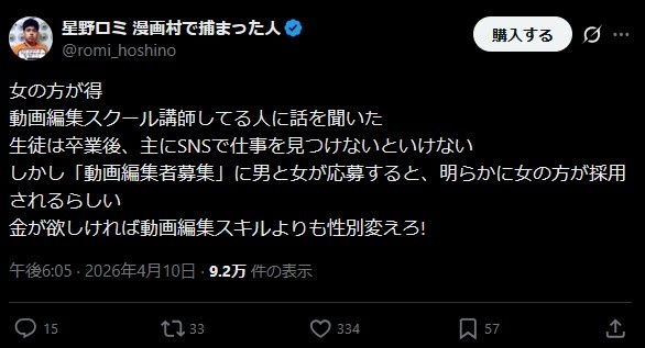 星野ロミ 漫画村で捕まった人 (@romi_hoshino) on X女の方が得 動画編集スクール講師してる人に話を聞いた 生徒は卒業後、主にSNSで仕事を見つけないといけない しかし「動画編集者募集」に男と女が応募すると、明らかに女の方が採用されるらしい 金が欲しければ動画編集スキルよりも性別変えろ!x.com - 2 : 2026/04/11(土) 22:35:00.15 ID:3xzS/dgT0